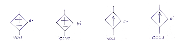 Now sources are of two types: Independent Sources and Dependent Sources. An Independent Source (ideal) is an active element that provides a specified voltage or current which is completely independent of other circuit elements. Examples of independent sources are 10 V, 5 A etc. A dependent source (ideal) is also an active element in which the source quantity is controlled by another voltage or current. Four possible types of dependent sources are