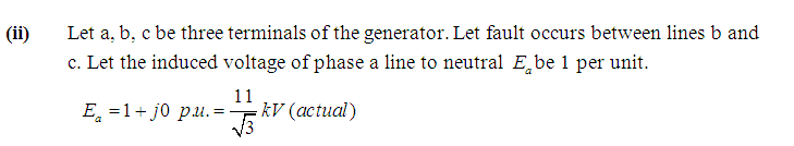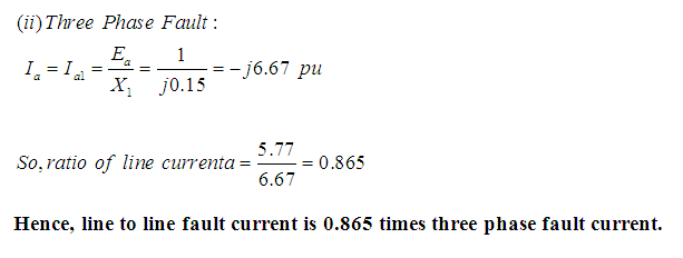 Problem 4: A 3-phase, 11 kV, 10 MVA generator has direct axis sub-transient reactance of 0.15 per unit and negative sequence reactance of 0.15 per unit. It is on no load and rated terminal voltage. Calculate the ratio of line currents for a line to line fault to three phase fault. Neutral is solidly grounded.